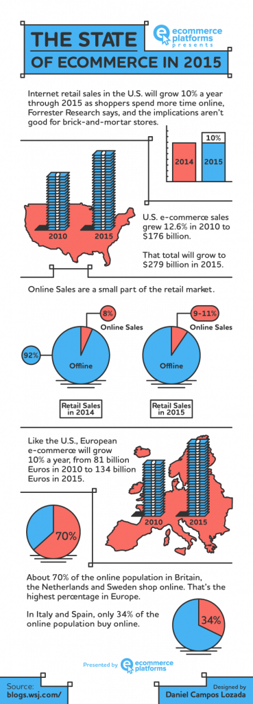 Based on a Wall Street Journal report, this infographic shows that the total eCommerce sales volume in the US recorded at $176 billion in 2010 is projected to reach $279 billion in 2015. About 8% market share of total US retail sales was held by online sales in 2014 and this is estimated to rise and reach between 9 and 11% in 2015.